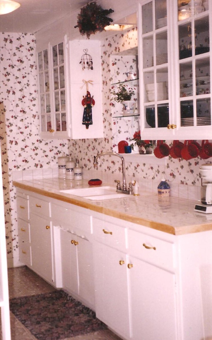Inexpensive kitchen facelift. Cabinets painted white, new hardware, stock white tile, 4 glass doors, wallpaper, clearance faucet and stock home center sink.